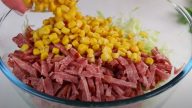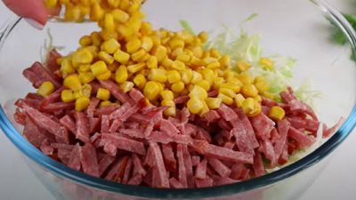 Na proužky nakrájené zelí smíchejte s nakrájeným salámem. K ingrediencím přidejte kukuřici a krutony.