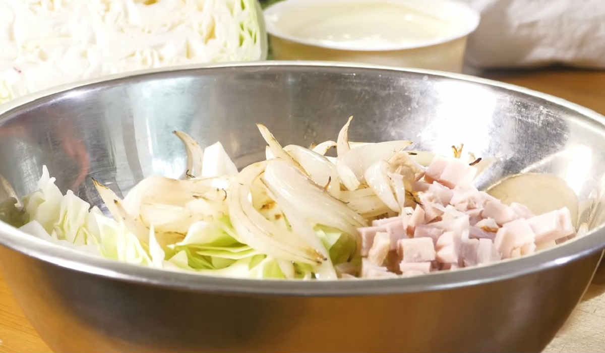 Mezitím si omyjte hlávku zelí a ostrým nožem ji nakrájejte na středně velké kostičky. Pak zeleninu přihoďte k cibuli do pánve a chvíli restujte. Nakonec odstavte z plotny a pusťte se do přípravy ostatních ingrediencí. Šunkový salám pokrájejte na malé kostičky a vsypte do zeleninové směsi. Salát osolte, opepřete, zasypejte jemně nasekanou jarní cibulkou a důkladně promíchejte.