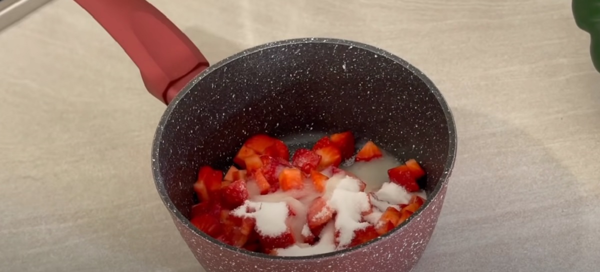 Zmrzlinu jsme zmrazili v nádobě obdélníkového tvaru o rozměrech 11 x 21 cm a výšce 5 cm. V první řadě dejte nasekané jahody, cukr a citronovou šťávu do hrnce.