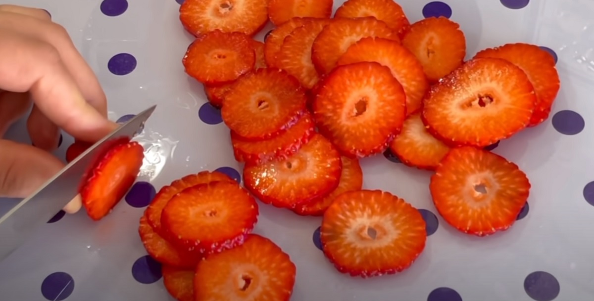 Mezitím nakrájejte několik jahod na tenké plátky.