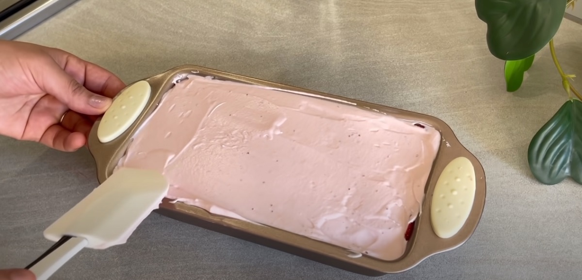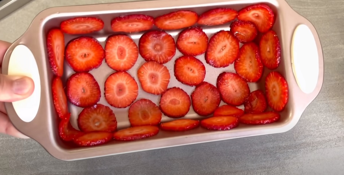Výslednou směs naneste do připravené formy vyložené jahodami a rovnoměrně ji rozložte.