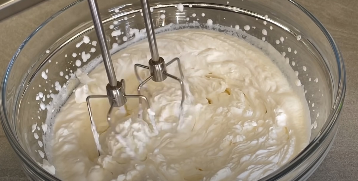 Nyní vyšlehejte smetanu mixérem, dokud nezískáte pevné špičky.