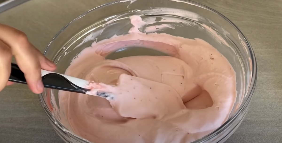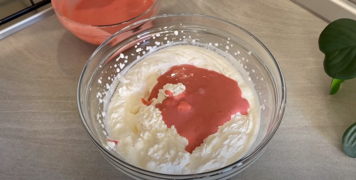 Studený jogurt smíchejte s jahodovým pyré.