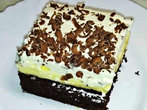 Během chladnutí korpusu připravte pudinkový krém. Vaječné žloutky smíchejte s cukrem a vanilkovým pudinkem. V hrnci přiveďte k varu mléko a vmíchejte do něj žloutkovou směs. Za stálého míchání vařte, dokud nezískáte velmi hustý pudink. Ten odstavte ze sporáku, vyklopte ho do čisté misky, zakryjte přilnavou fólií tak, aby ležela přímo na hladině pudinku, a nechte vychladnout. Máslo v míse vyšlehejte do pěny a po lžících k němu přidávejte vychladlý pudink a pokaždé dávku důkladně zapracujte. Hotový krém rozetřete do rovnoměrné vrstvy na vychladlý korpus a uhlaďte jej do roviny.